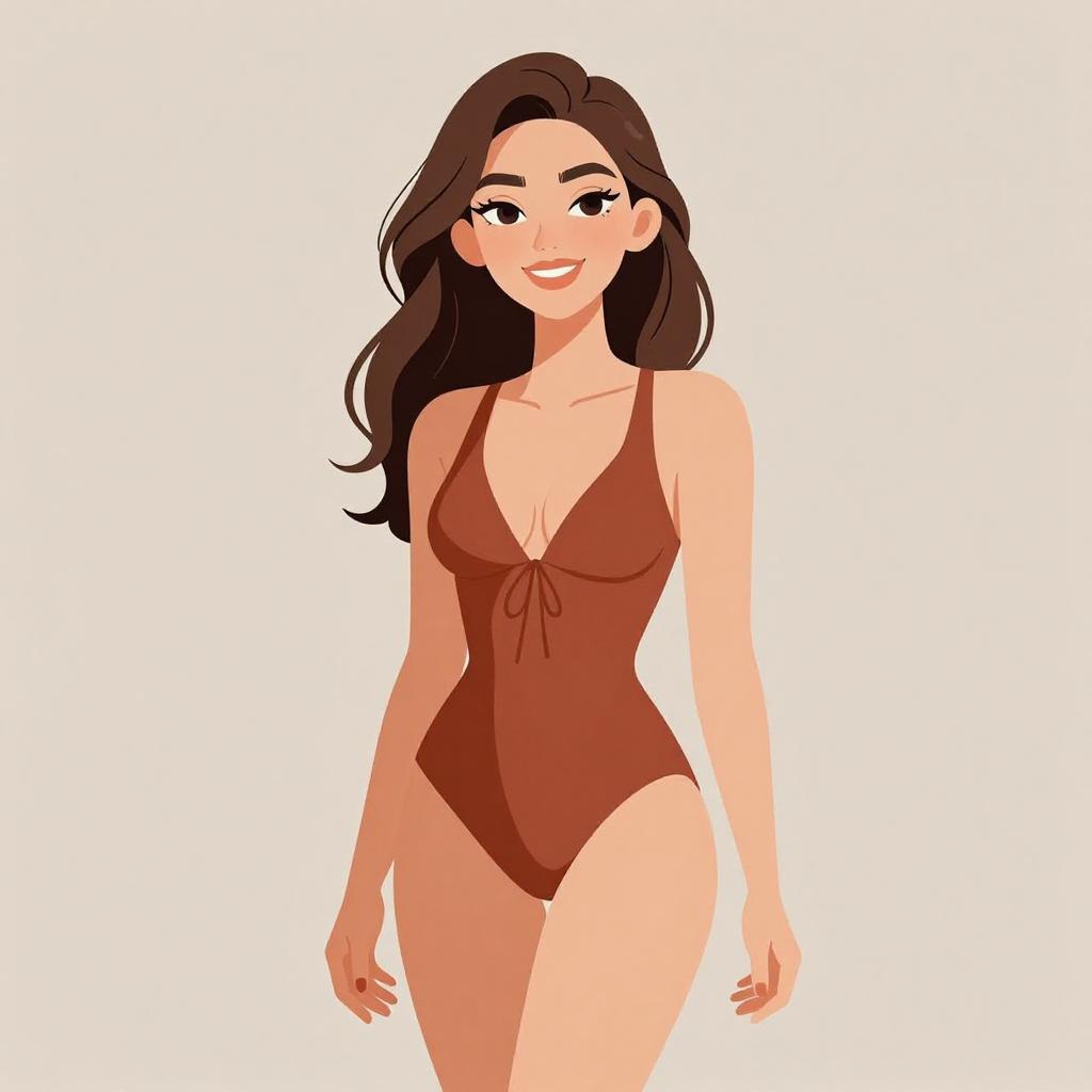 Illustration of a smiling woman with brown hair wearing a modern black and white checkered one-piece swimsuit. The swimsuit features a halter neck, plunging neckline with a keyhole cutout, and high-cut leg silhouette. The background is plain white, simulating a photo studio setting.