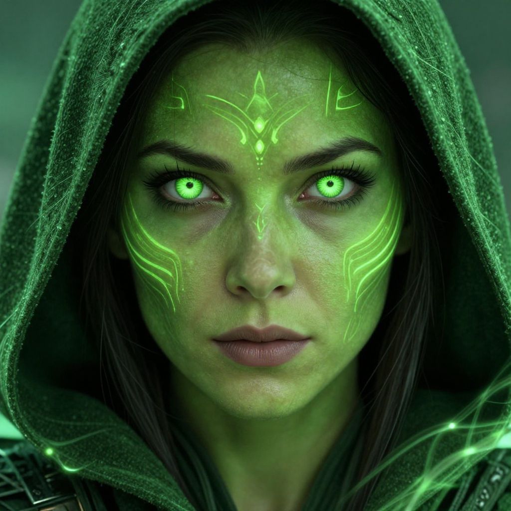 Close-up of a green Jedi woman's face with glowing green eyes, intricate facial markings and slightly glowing skin, hooded cloak framing her features, subtle force energy swirling around, hyper-realistic sci-fi fantasy portrait with dramatic contrast and vivid colors.