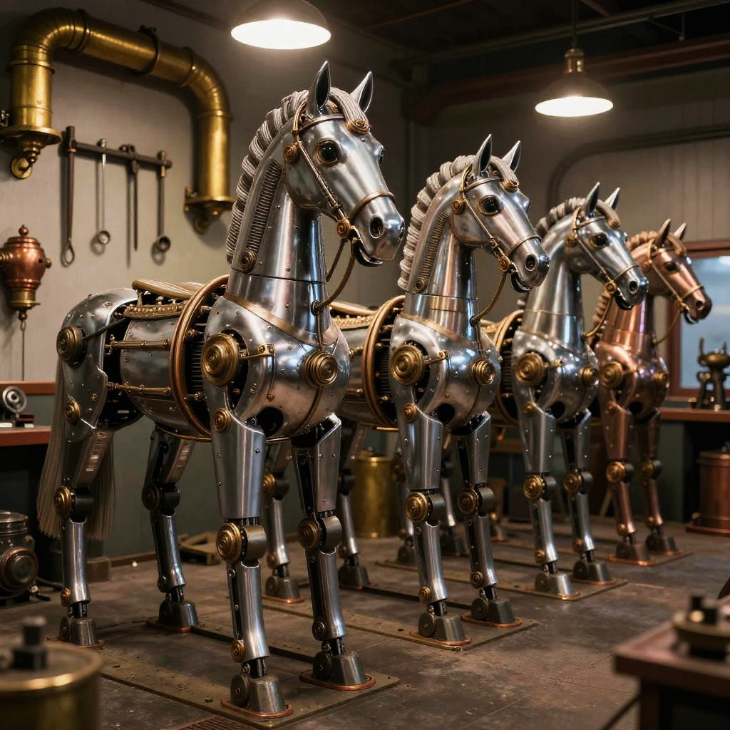 A futuristic stable for mechanical horses, huge metallic beasts with glowing circuits and steam vents, industrial design with reinforced steel beams and cogwheel decorations, antique lanterns casting soft shadows, robotic horse maintenance tools scattered on floor.