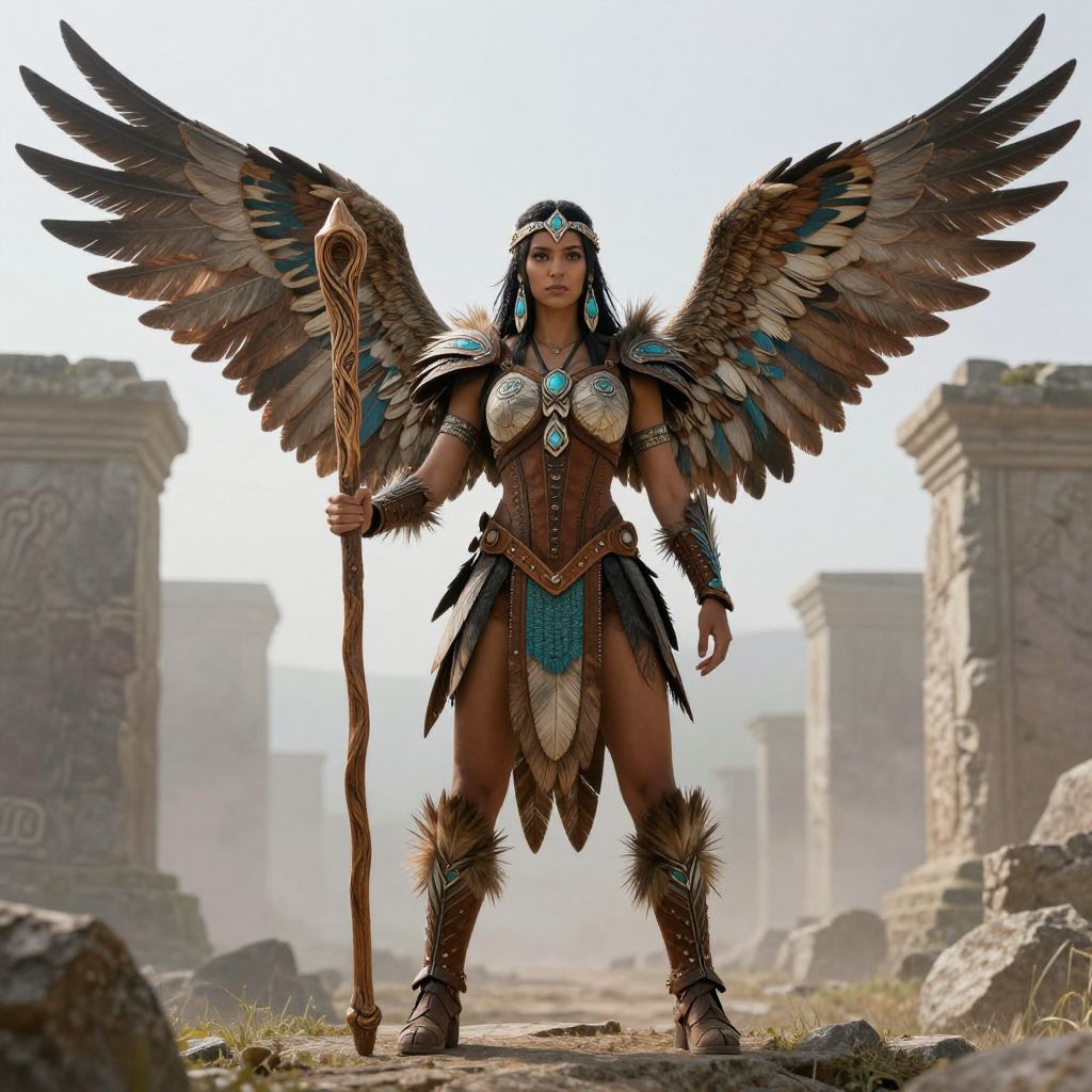 Digital artwork of a powerful, winged warrior woman with brown and blue feathered wings, wearing tribal armor, holding a staff, standing in a ruined