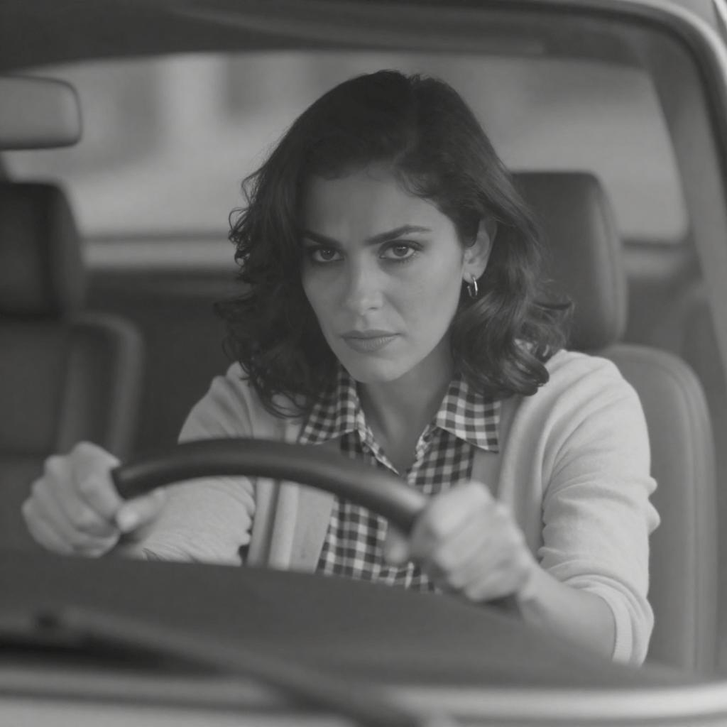 Photograph of a woman with curly brown hair and wide, anxious eyes leaning forward through a car window, gripping the glass. Behind her, a blurry woman with glasses and dark hair sits in the driver's seat. Green forest background. The woman in the foreground has a distressed expression. Both women are inside a red car.
