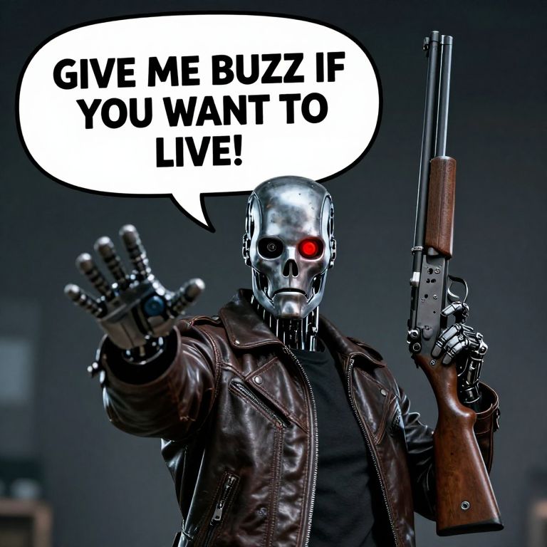 A realistic scene, The terminator, in leather clothing, one robotic red eye, reaching is left hand to the viewer, saying in a large speech bubble, \"GIVE ME BUZZ IF YOU WANT TO LIVE!\", on the right hand holds a shotgun, pointing up