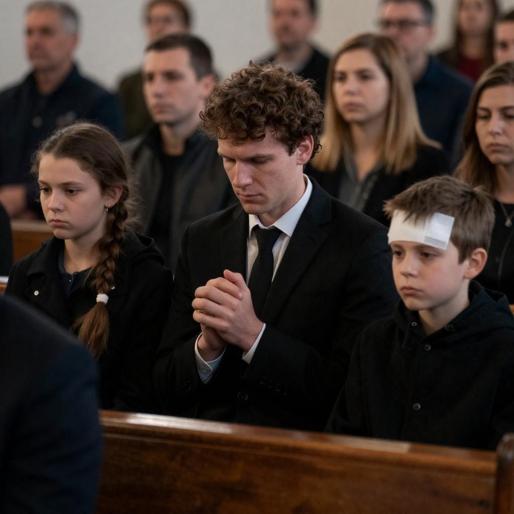 Photograph of a church congregation. Central figures: man with curly brown hair, black suit, hands clasped, looking down; young girl with braided brown hair, black coat, serious expression; young boy with short brown hair, white bandage on forehead, black coat, looking right. Background: adults, dim lighting, wooden pews. Intense expressions on faces.