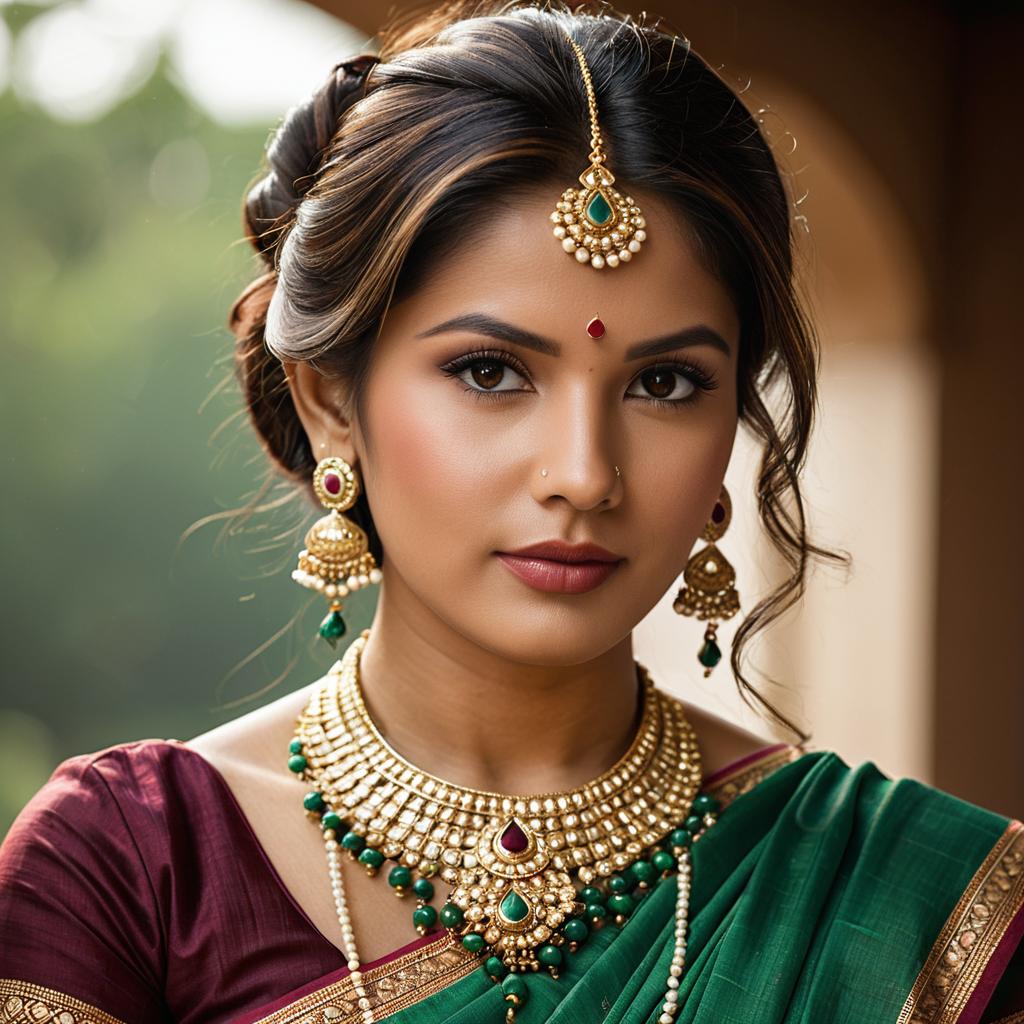 Indian hairstyle medium, photorealistic portrait of beautiful Indian woman, traditional attire, elaborate gold jewelry, forehead bindi, wavy brown hair in updo, green and maroon saree, detailed facial features, brown eyes, serious expression, soft natural light, slightly blurred background, bokeh effect, realistic ures, high detail, close-up, ethnic beauty, traditional Indian fashion, elegant, realistic CGI, realistic lighting, ornate earrings, layered necklaces, symmetrical composition