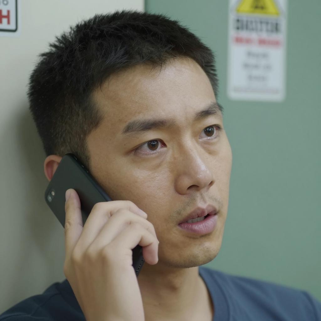 Close-up of a man with light brown skin wearing a light blue shirt, holding a red corded telephone receiver. Multiple silver rings adorn his right hand. The man has intense, focused eyes looking slightly to the left with a blurred green background.