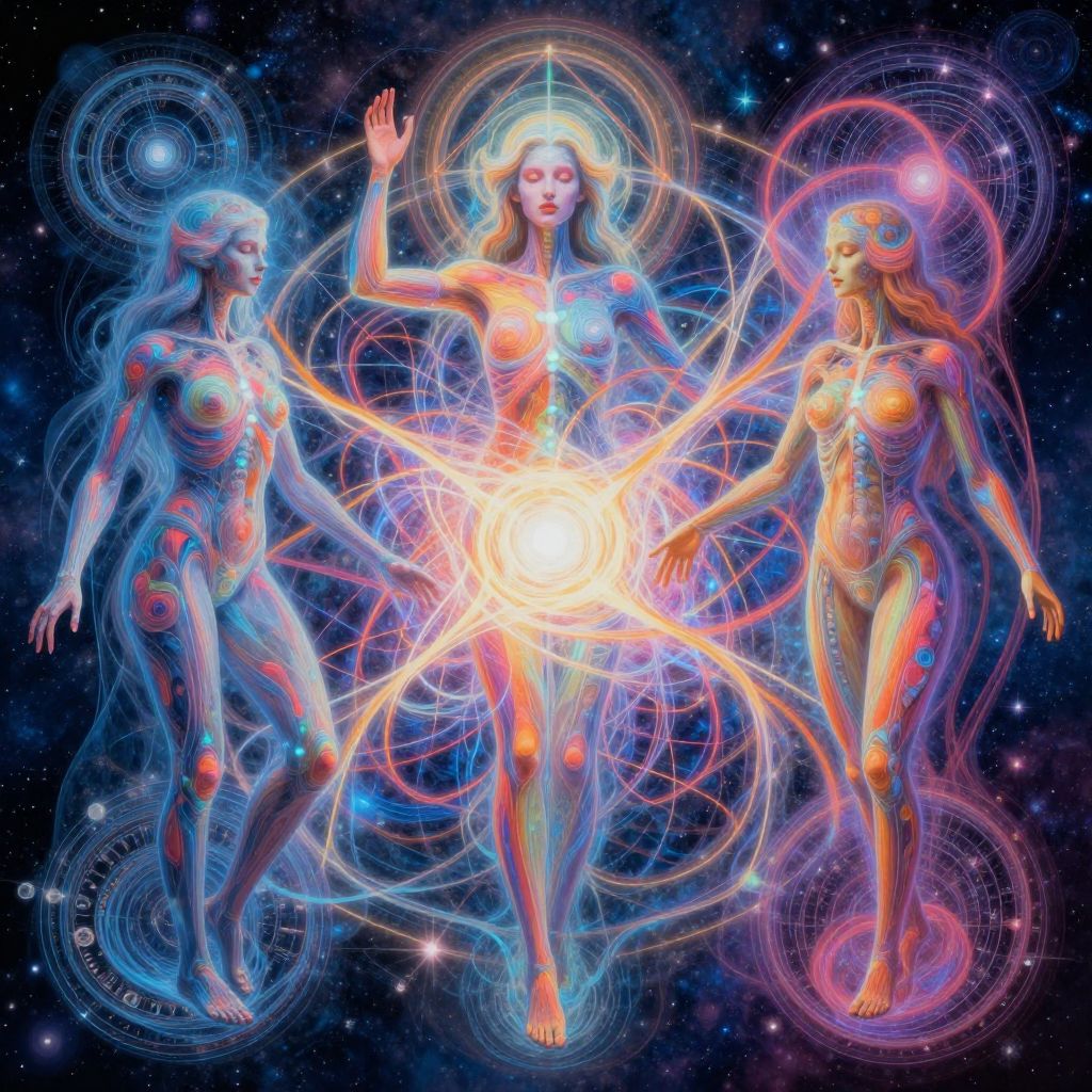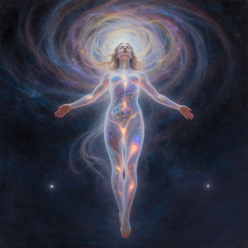 A realistic detailed cinematic painting of a beautiful clear glass vibrant consciousness of human evolution, strange miraculous entity reflecting light prism, life cycle, death, afterlife, reincarnation, love, memories, reuniting, spiritual enlightenment, manifestation, god, peace, opal statues adorned in jewels, by david a. hardy, kinkade, lisa frank, wpa, public works mural, socialist