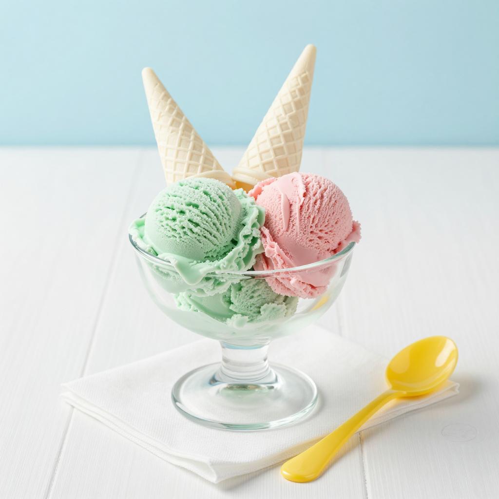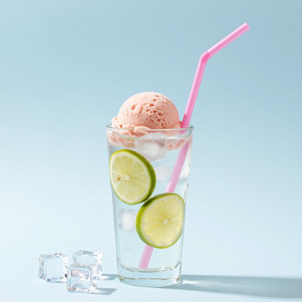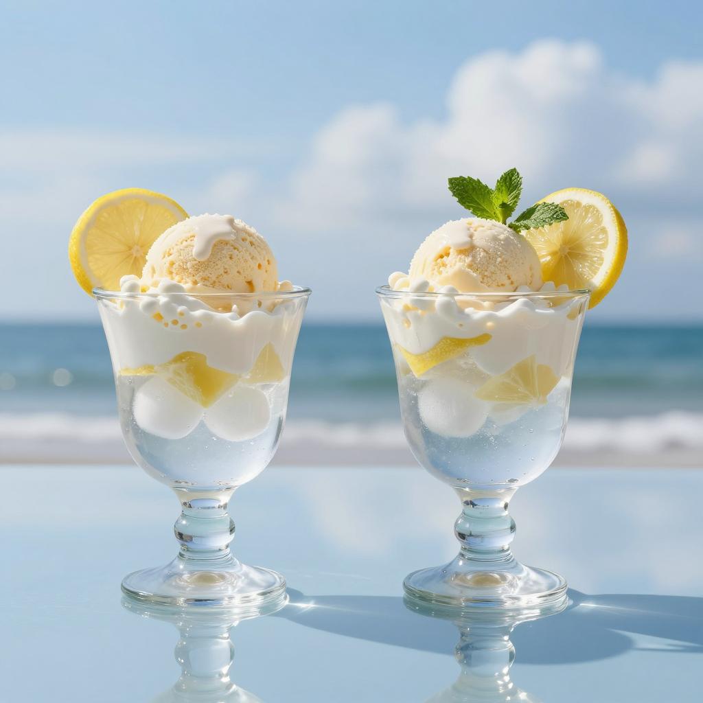 Two clear glass cups with layered desserts. Each cup has a scoop of ice cream on top, lemon slices, and a sprig of mint. Cups filled with ice water, standing on a reflective blue surface. Ocean and cloudy sky in the background. Light blue color palette. Reflective surface below cups.
