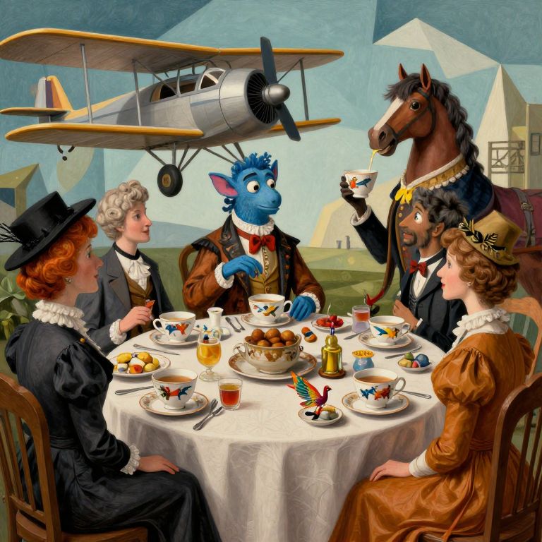 This vibrant digital illustration depicts a whimsical tea party featuring anthropomorphic animals and humans. Seated around a white-clothed table are a blue-furred cat in a brown jacket, a brown horse in formal attire holding a teacup, and two humans with Victorian-style clothing, one with red hair and the other with brown hair. A vintage biplane hovers above, adding a surreal touch. The table is adorned with teacups, saucers, plates of pastries, and a bottle of wine. The background showcases a stylized, geometric landscape with blue skies and abstract buildings. The overall style is colorful and playful, blending Victorian elegance with fantasy elements.