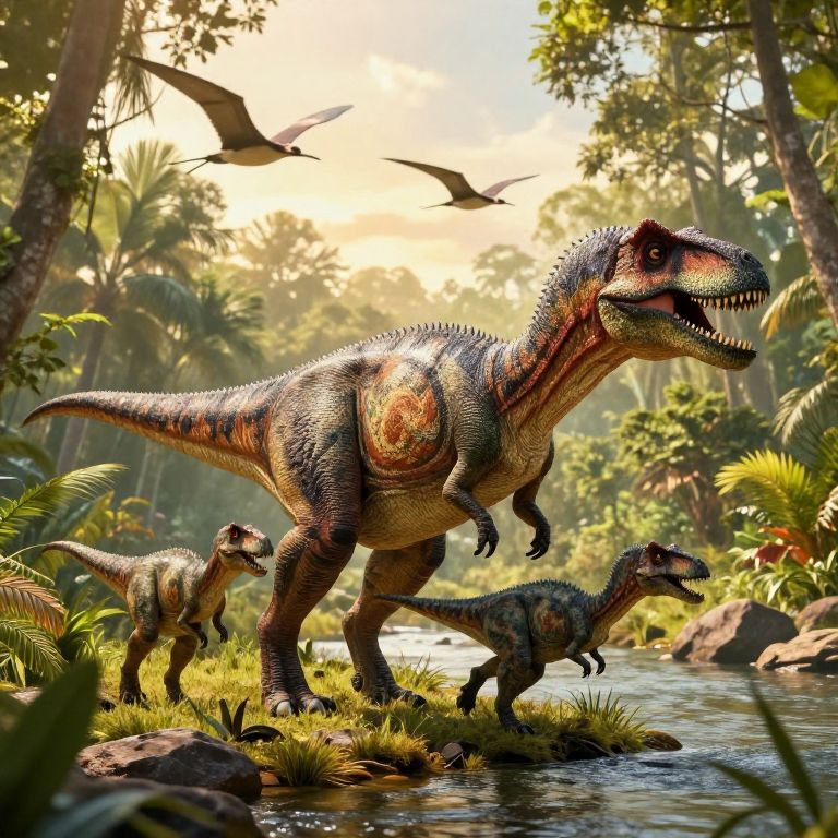 Dinosaur family walking along a riverbank in a vibrant primeval forest, dynamic composition with flying pterosaurs overhead, warm golden hour lighting, intricate patterns on dinosaur skin, detailed plants and rocks, photorealistic rendering.