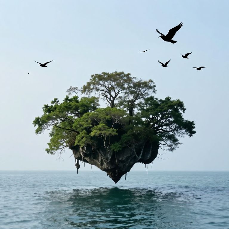 Suspended above a tranquil sea, a solitary island defies gravity with its lush greenery and gnarled trees, while silhouetted figures and winged birds hover in a dreamlike expanse where reality bends and logic dissolves.
