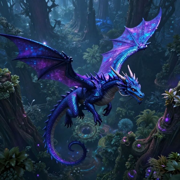 Imagine an enchanting digital artwork depicting a majestic dragon soaring above an ancient, enigmatic forest. The dragon's scales gleam with mesmerizing shades of deep blues and purples, reflecting the mystical light filtering through the dense foliage. From a unique aerial viewpoint, this captivating scene captures both the grandeur of the mythical creature and the intricate allure of the magical woodland below, masterfully blending elements of fantasy and mysticism into an awe-inspiring tableau that evokes a sense of wonder and enchantment.
