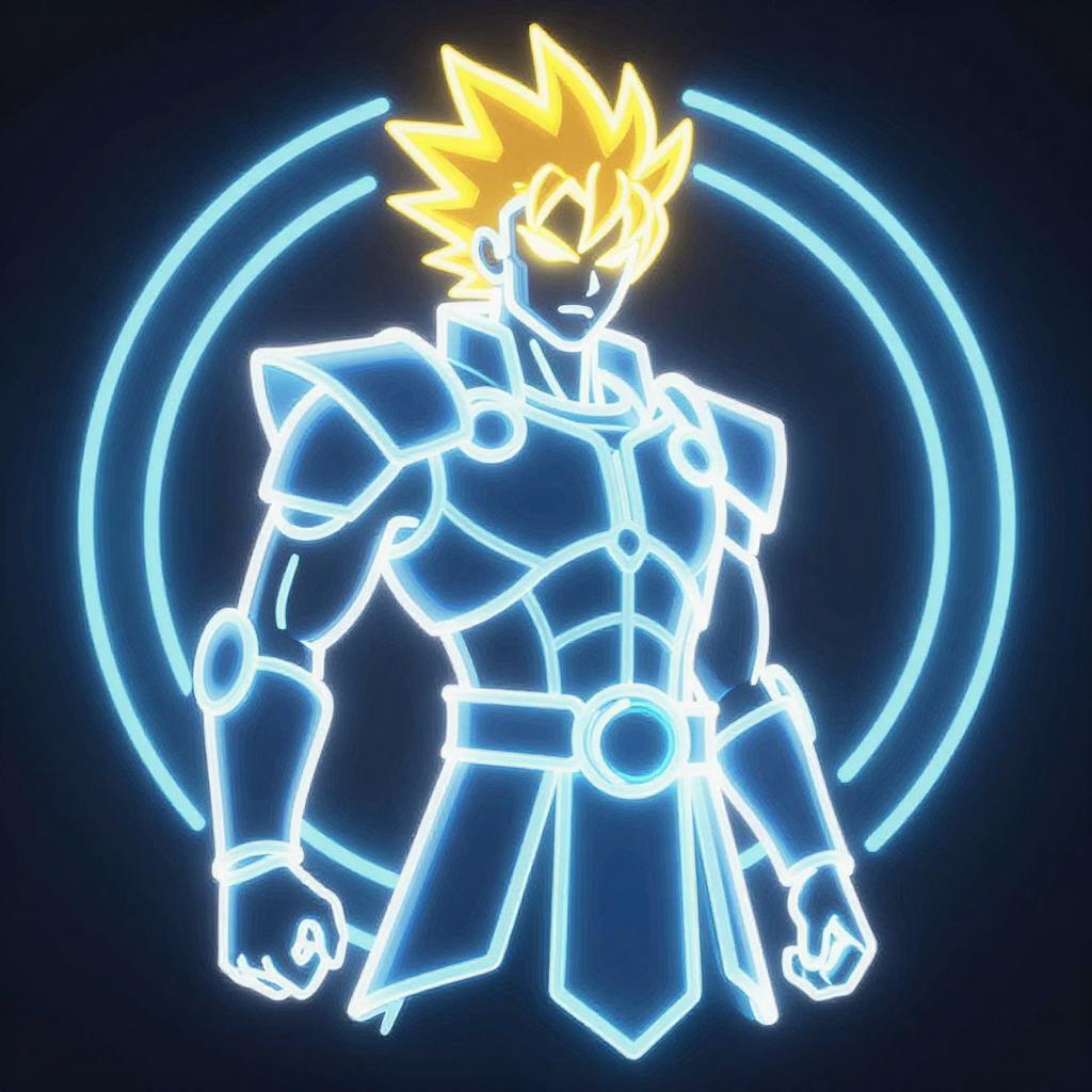 Glowing neon artwork of a futuristic gladiator warrior with spiky yellow hair and blue armor, set against a dark background with circular neon designs.