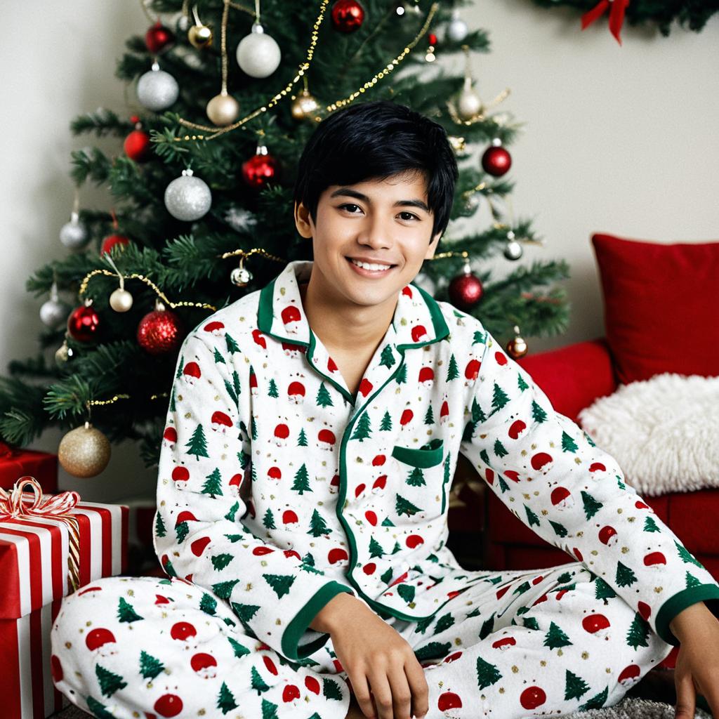 Christmas crew pajamas,1boy, male focus, solo, christmas tree, sitting, christmas, black hair, looking at viewer, smile, christmas ornaments, gift, black eyes