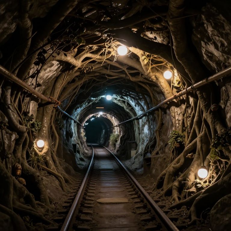 An underground subway system connects the roots of dreamers, its tunnels lit by the glow of unconscious thoughts.
