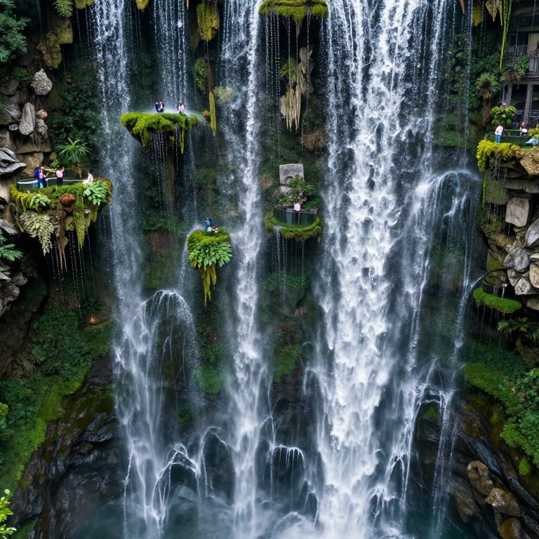 A city of upside-down waterfalls, where citizens cultivate floating algae gardens within the cascading droplets.
