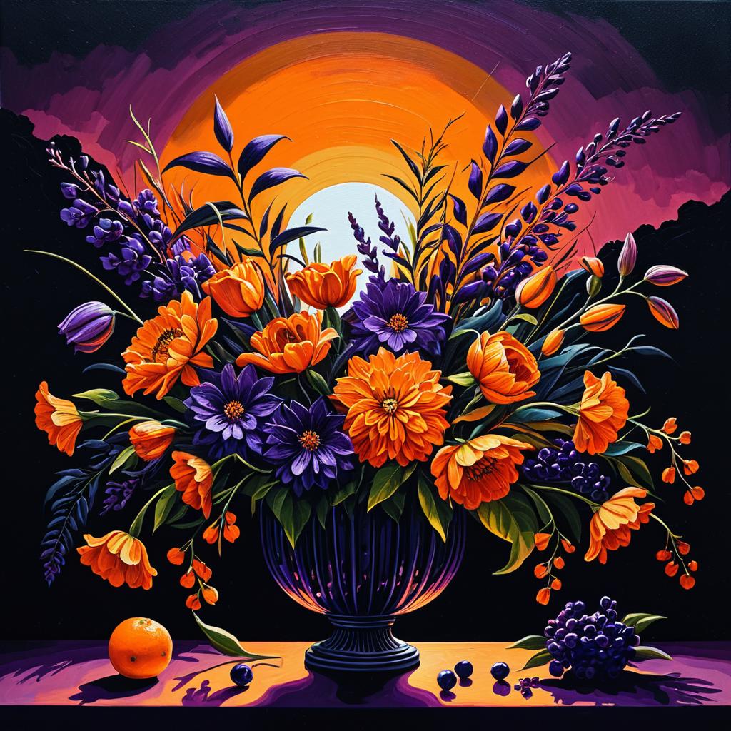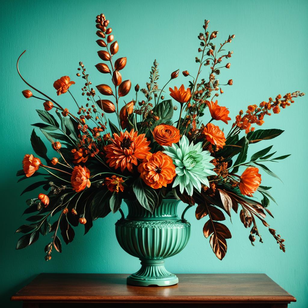 Mint green and warm copper, vivid colors, high contrast, detailed floral arrangement, oil painting, vibrant, realistic, 4k, ultra-detailed, surreal, dynamic lighting, luxurious, botanical, rich textures, modern, decorative, elegant composition