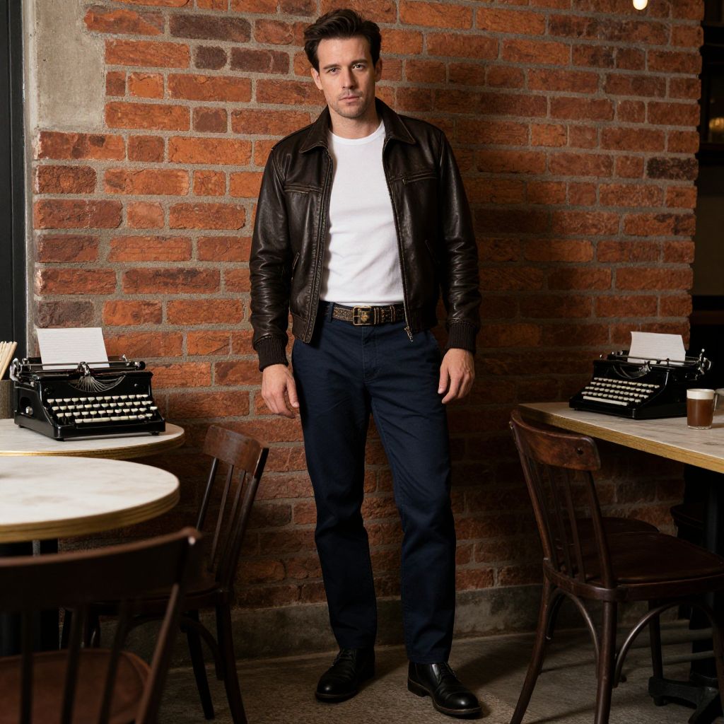 A man, rockabilly leather bomber jacket, white fitted t-shirt, dark blue chinos, black leather boots, vintage-inspired belt, historic brick building, vintage typewriters, cozy coffee corner, camera obscura style, confident expression. Man has masculine face and piercing eyes