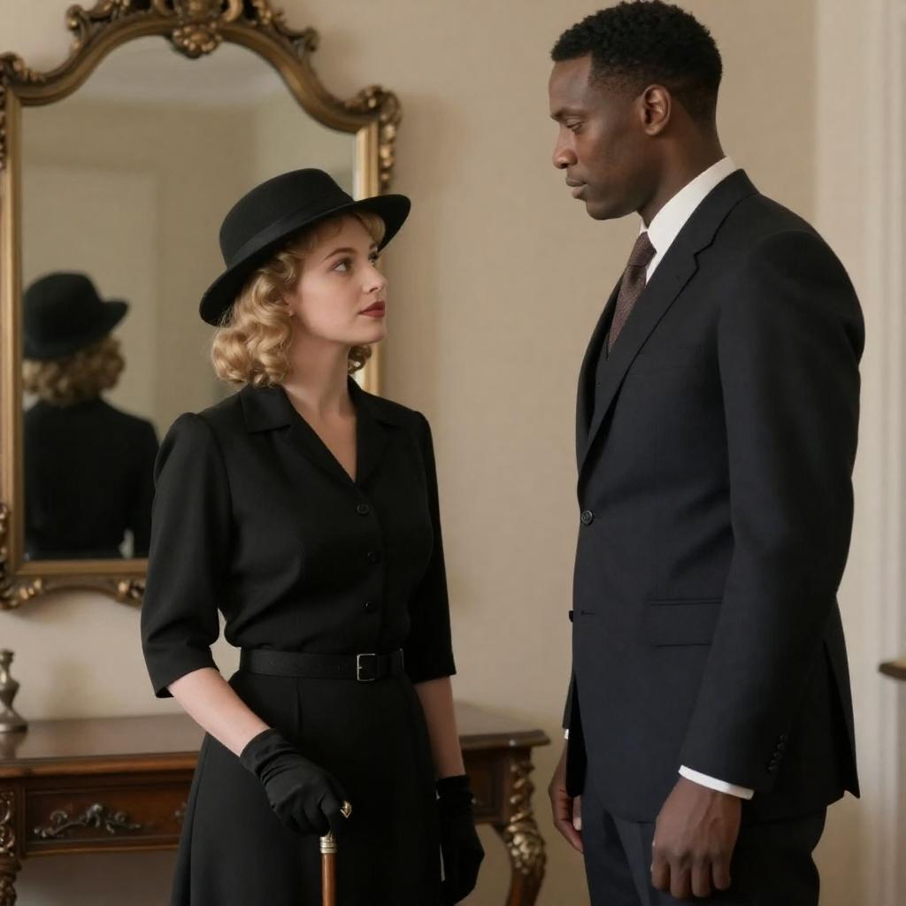 Photograph of a vintage-themed bar scene with six people. A black man in a green suit and black hat stands center, facing a woman in a white dress on the left. Four men in black military-style uniforms stand to the right. The background features dark walls with framed photos and a green, leafy ceiling light. A wooden barrel is in the foreground.