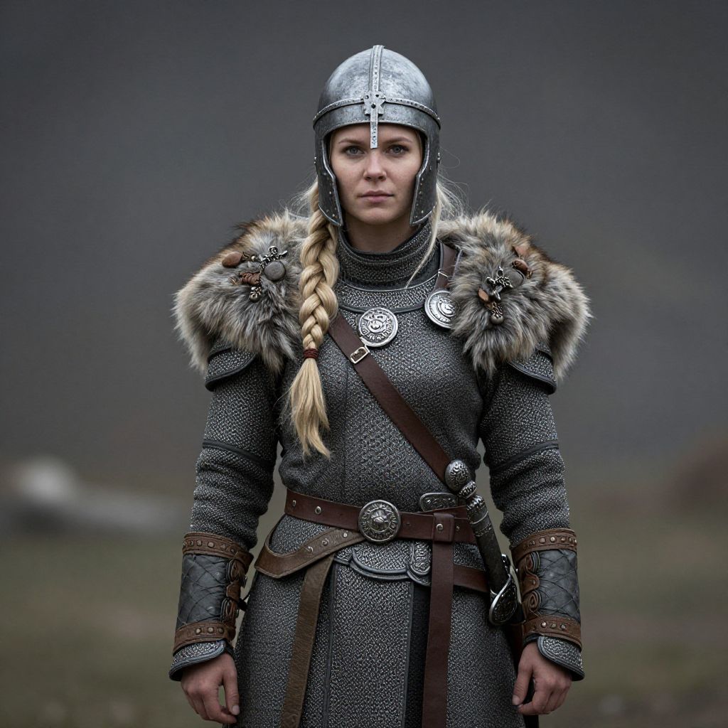 This is a photograph of a young, serious-faced woman standing outdoors against a misty, gray background. She wears medieval Viking armor, including a silver helmet with a nose guard and a braided blonde ponytail. Her gray, textured chainmail is adorned with a fur-lined shoulder piece and brown leather straps with metal buckles. She has a round, silver brooch on her chest and a brown belt with a circular buckle. Her hands are relaxed by her sides. The armor is detailed and realistic, with a focus on historical accuracy. The overall mood is somber and intense.