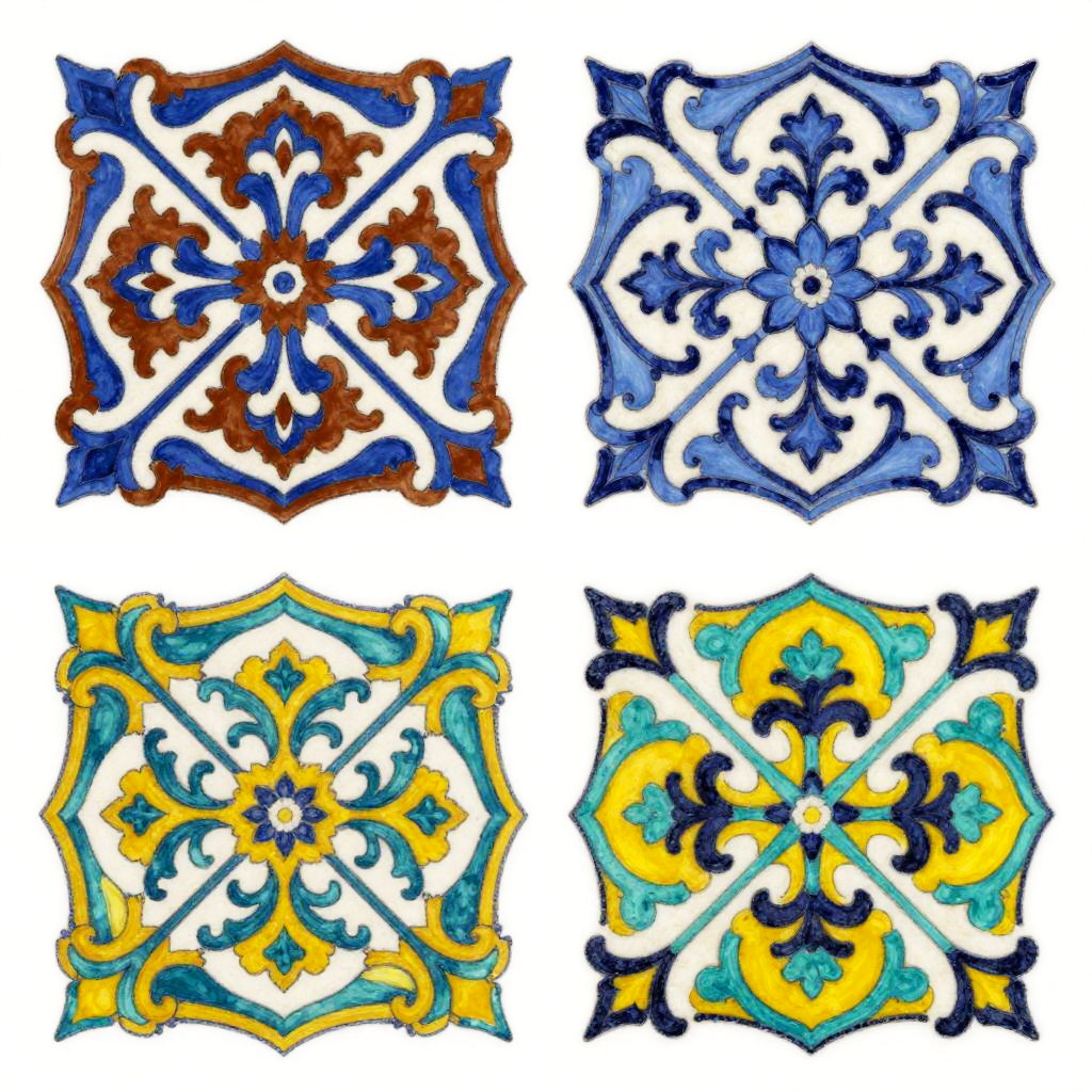 This image is a digital collage featuring four vibrant, intricately patterned tiles. Each tile showcases a different, colorful, symmetrical design with swirling, floral motifs in shades of blue, brown, yellow, and teal. The top left tile has a bold brown and blue pattern, the top right is more delicate with blue and white, the bottom left is rich with teal and yellow, and the bottom right combines yellow, teal, and black. The overall style is reminiscent of traditional tile art.