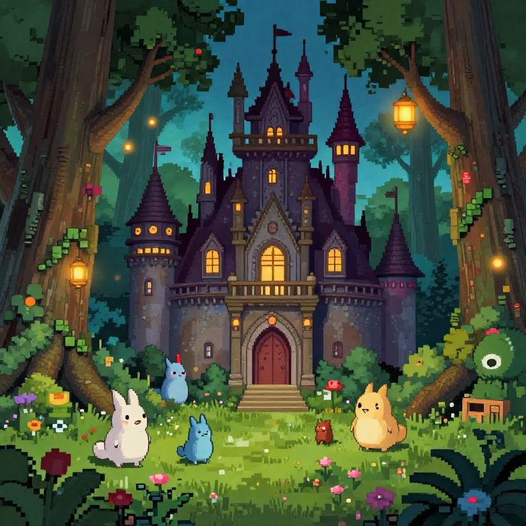 Ghibli pixel art of a mysterious old castle surrounded by whimsical creatures, glowing lanterns, and towering ancient trees, charming saturated palette and pixel textures that create an enchanting fantastical world reminiscent of Studio Ghibli films.