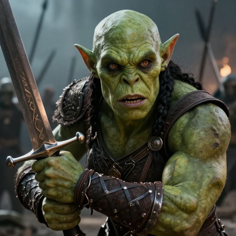 CGI image of a fierce, muscular green orc warrior with pointed ears, dark braided hair, gripping a sword, in a smoky battle scene