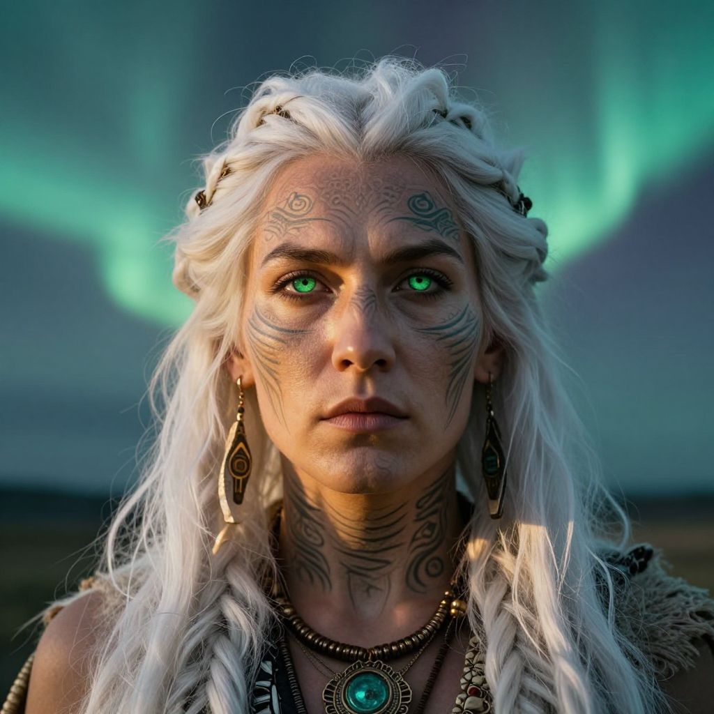 Photograph of a white-haired woman with green eyes, tribal face paint, braided hair, and Nordic jewelry, set against a green Northern Lights sky