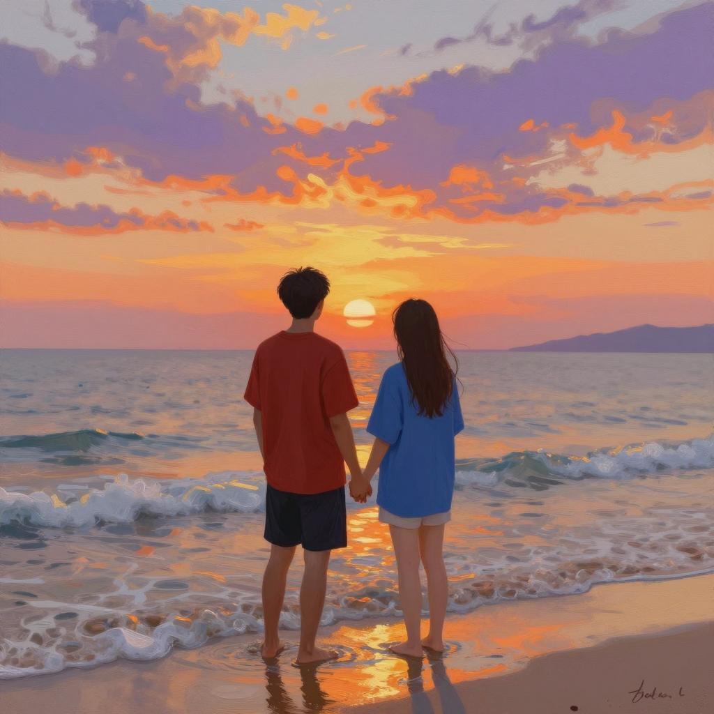 Two people stand on a beach at sunset. The person on the left has short hair, wears a red shirt, and holds the hand of the person on the right, who has long hair and wears a blue shirt. Both stand in shallow water, facing the sun, which casts vibrant orange, yellow, and purple hues across the sky and water. The sky is filled with streaky clouds. Waves gently touch the shore. The artist's is in the bottom right corner. The style is a colorful, impressionistic painting.