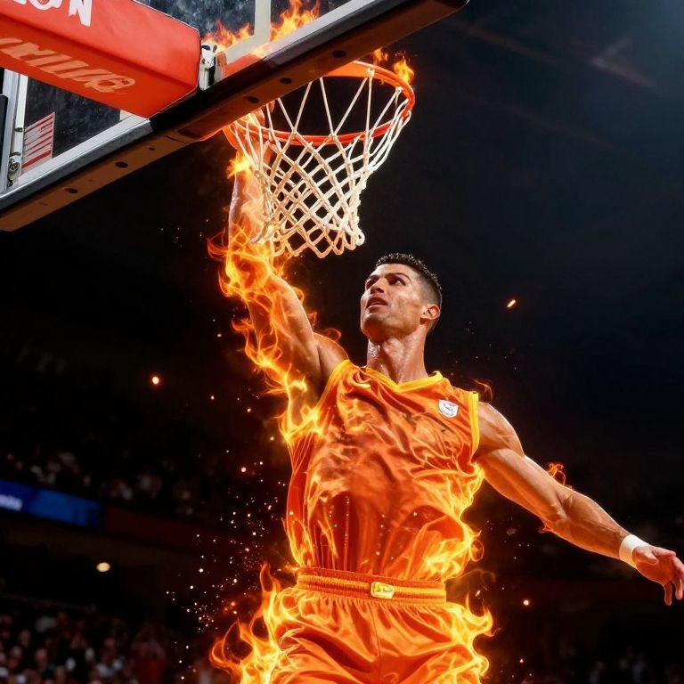 LeBron goofy pose on basketball court, exaggerated fun style, vivid color palette, energetic crowd in stands, comic style illustration, smiling widely with tongue out