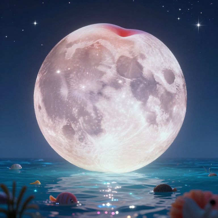 Create an enchanting dreamlike scene inspired by surrealism, featuring a colossal moonlit peach suspended above a tranquil ocean. From a close-up perspective beneath the giant fruit, capture the ethereal glow it casts on the surrounding marine life and shimmering starlight reflections on its surface. This whimsical composition evokes wonder and tranquility, inviting viewers to delve into the enigmatic depths of their imagination as fantasy intertwines with reality in a mesmerizing display.
