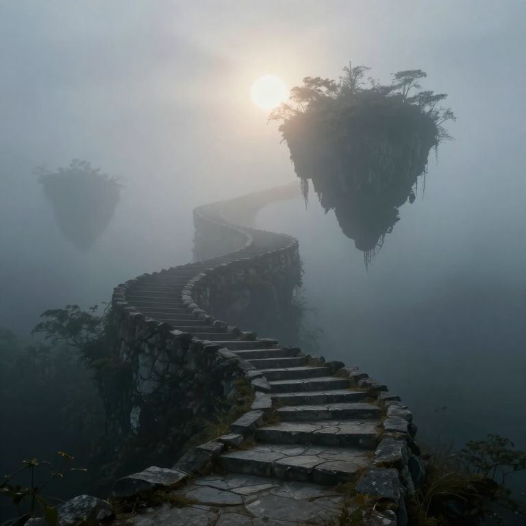 Misty, ethereal photograph of a winding stone staircase ascending to floating islands with sparse trees, bathed in soft, diffused sunlight.