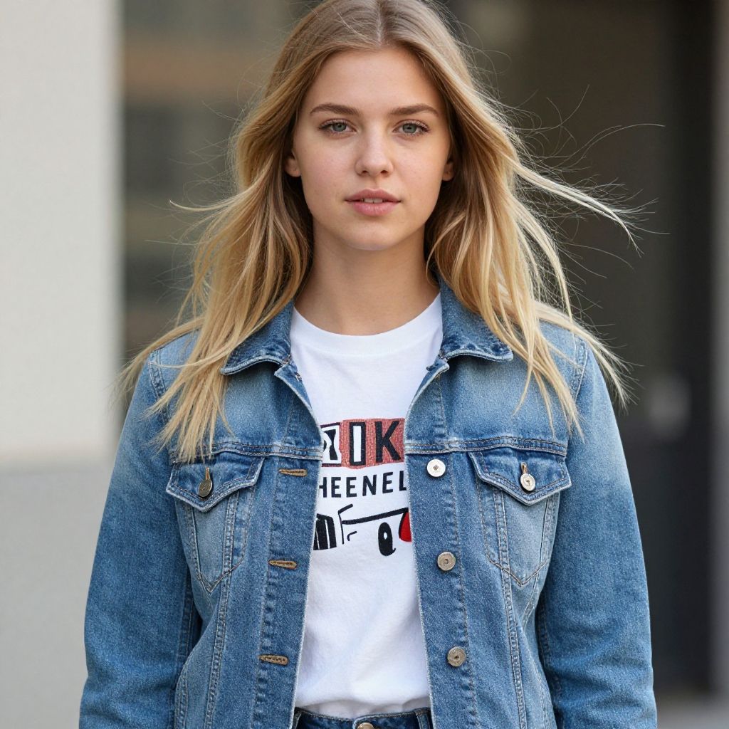 A young woman with long blonde hair wears a classic blue denim jacket over a graphic white t-shirt. The image captures a natural, candid moment with soft wind gently blowing her hair, highlighting a contemporary casual fashion style.