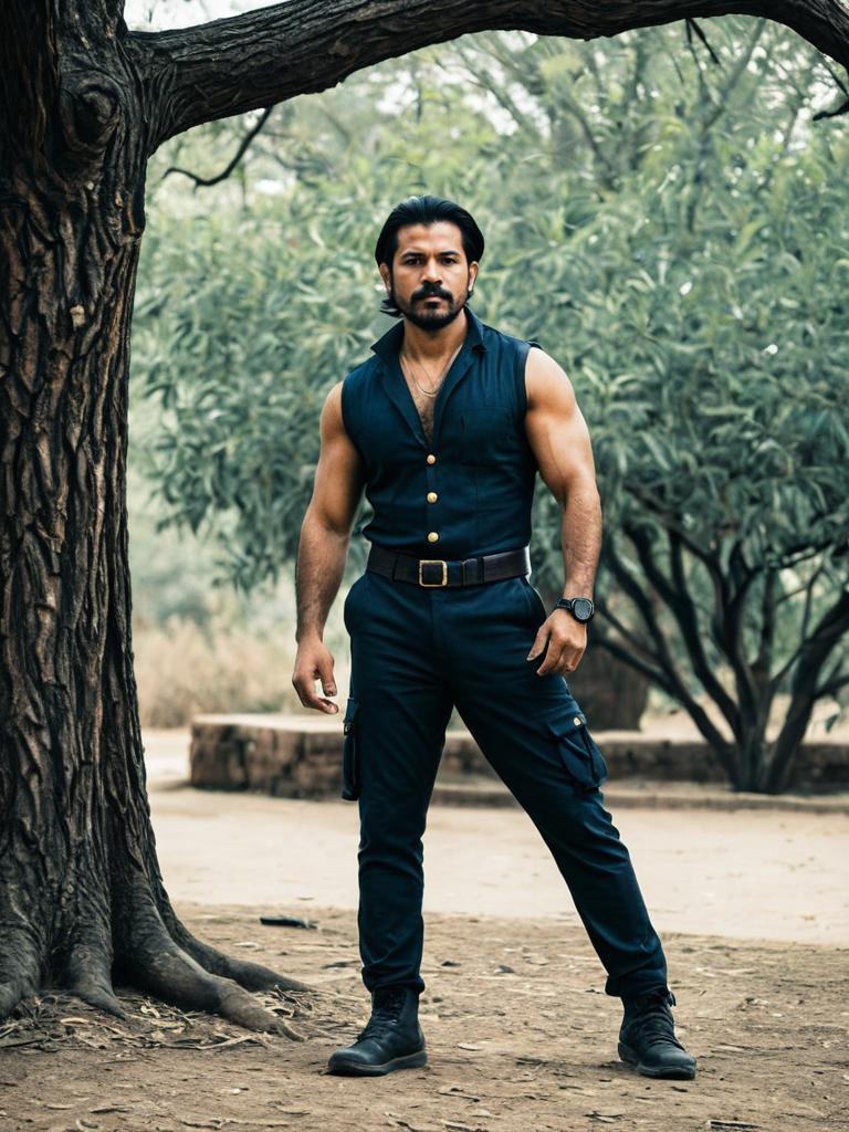 Last second costume guy, facial hair, male focus, beard, blurry background, blurry, belt, gloves, standing, solo focus, 1boy, full body, multiple boys, weapon, mustache