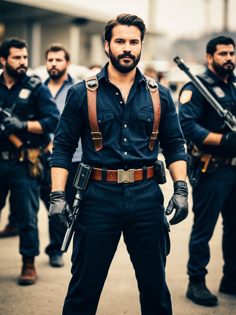 A group of men dressed in dark tactical uniforms stand outdoors. The central figure has a beard and mustache, wearing a dark shirt with leather suspenders, gloves, and a belt equipped with holstered weapons. The background is blurred, highlighting the main subject and his serious expression.