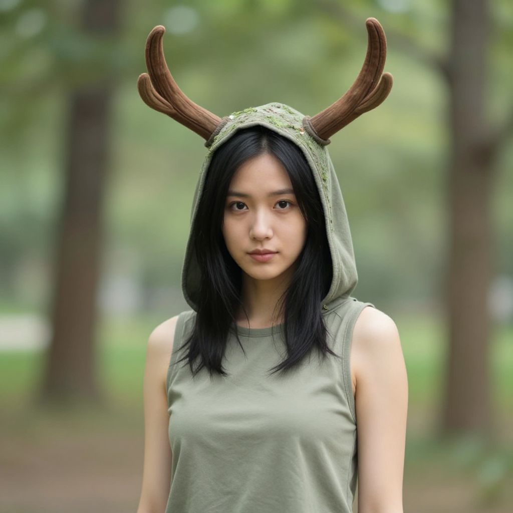 Photograph of an Asian woman with long black hair standing in a forest. She wears a green hoodie with brown antler-like headgear, resembling a deer. Her expression is neutral, with slightly parted lips. The background is blurred with tall trees and green foliage. She is wearing a sleeveless green top that matches her hoodie. The image has a soft, natural light with a shallow depth of field, focusing on the subject while the background remains blurred. The overall style is whimsical and slightly surreal.