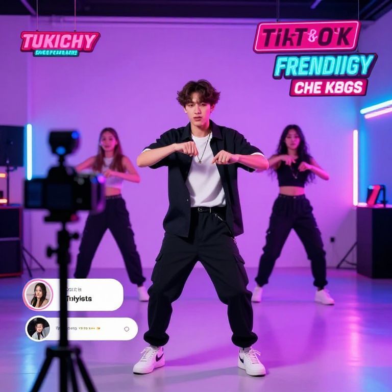 A young influencer filming a TikTok dance challenge in a neon-lit studio, surrounded by trending hashtags and filters, showcasing the latest social media viral trends.