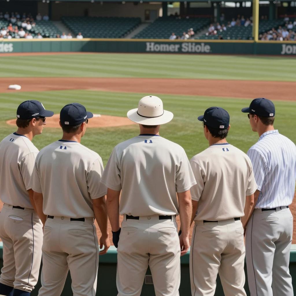 Photograph of several men from the back, standing in a baseball stadium. Five men wear beige or light-colored shirts, one wears a white hat and beige pants. One man in blue and white striped shirt. Baseball field with green grass and red dirt in background. Crowded stands in distance. Bright daylight.
