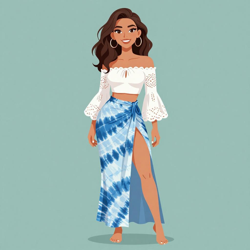 Woman with pretty face and pretty hair. smiling Woman, summer clothing, off-the-shoulder white crop top with long bell sleeves and lace detailing, high-waisted maxi skirt with blue and white tie-dye pattern, double thigh-high slits, barefoot. --sref 1467