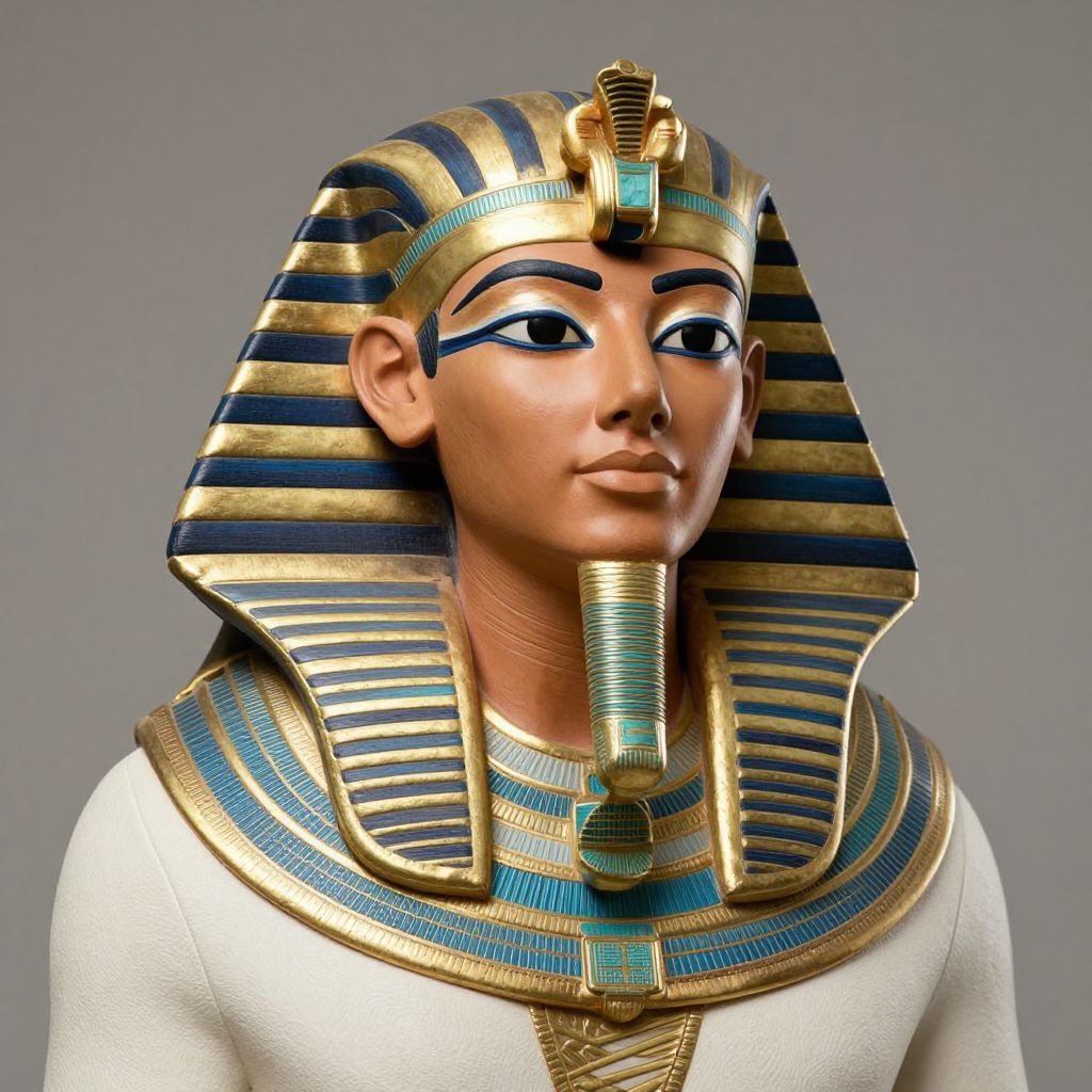 Photograph of an Egyptian-style mask with a golden headdress, blue and gold stripes, and detailed black eyes, wearing a white garment.