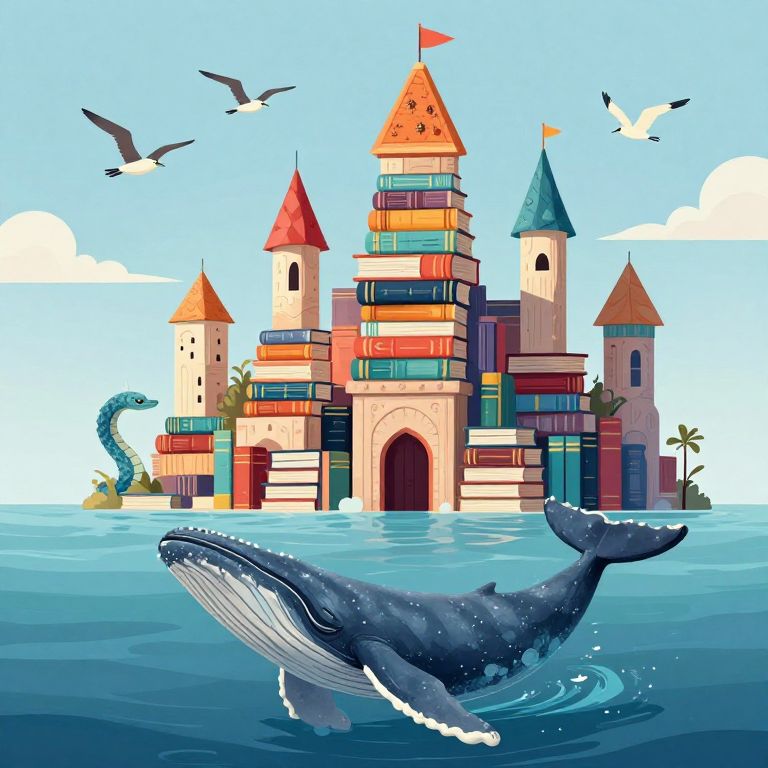 Books tower majestically above a tranquil ocean, their colorful spines forming a whimsical castle-like structure, while a majestic whale glides gracefully beneath the waves, accompanied by a mythical sea serpent and playful birds soaring overhead.