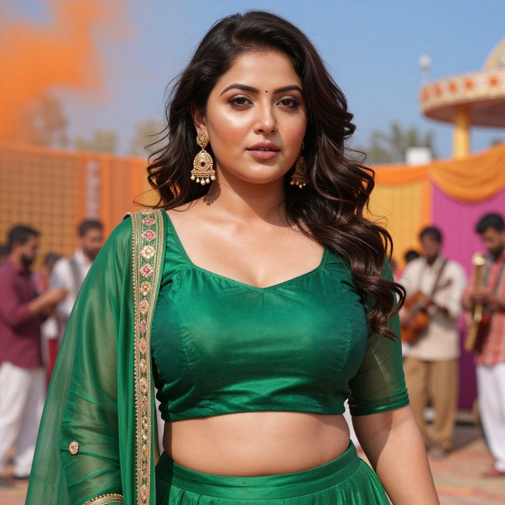 A detailed close-up of a woman with round, sun-kissed face, full lips, and dark wavy hair wearing a flowing green silk lehenga choli, standing in a traditional Holi festival backdrop with colorful powder, bright orange and blue skies, and festive music playing in the background.. The woman has big tits and cute face