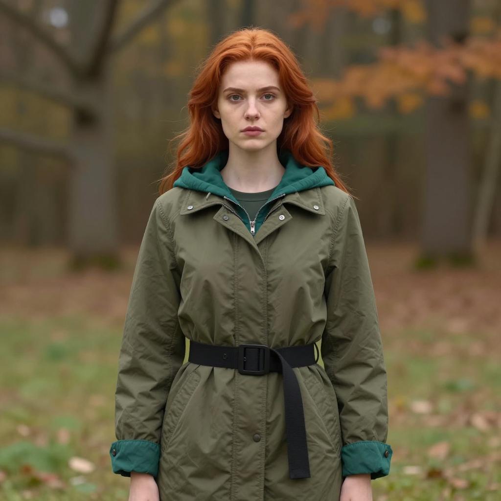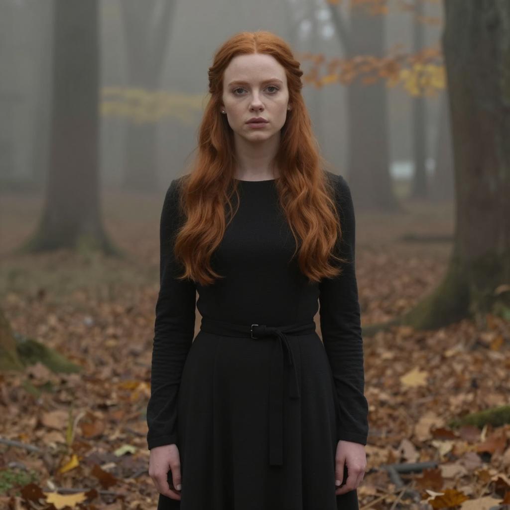 A young woman with long red hair wearing a black sweater and a yellow, black and white checkered scarf standing in an autumn forest with tall trees and golden leaves on the ground, soft natural lighting, warm orange and yellow color tones, realistic portrait style