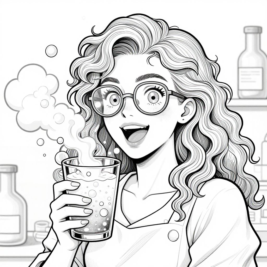 The image is a detailed black and white line art illustration, perfect for coloring in. It features an excited woman with voluminous, curly hair that cascades down her shoulders. She is holding a glass filled with a bubbling, magical liquid, which emits a cloud of bubbles and smoke, adding a sense of wonder and enchantment to the scene. The woman's glasses reflect the light, enhancing her lively expression. In the background, a bottle is partially visible, suggesting a setting that might be a laboratory or a magical environment. The overall composition is dynamic, with the woman and her glass as the central focus, surrounded by the magical elements that create a captivating and imaginative atmosphere.