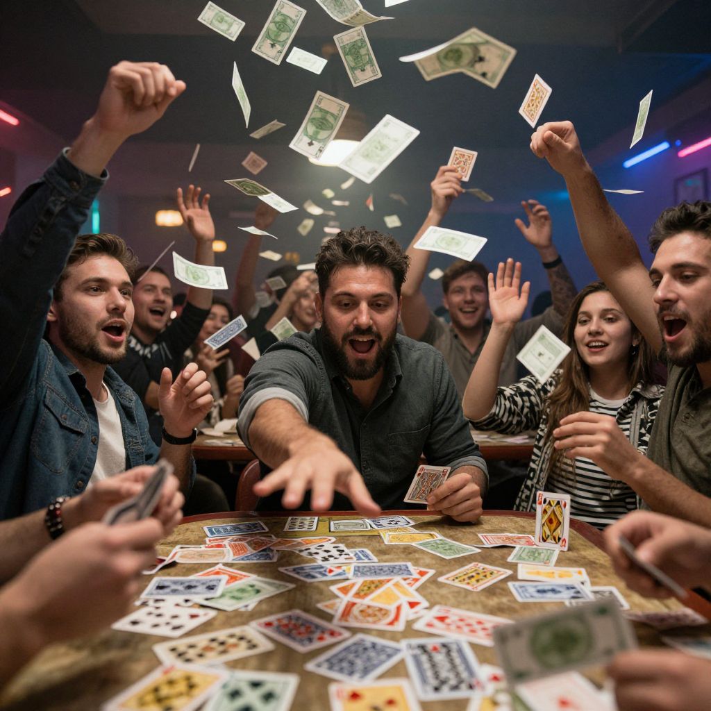 Photograph of a lively group of diverse young adults celebrating at a poker table, cards flying, money in the air, expressions of excitement and joy.