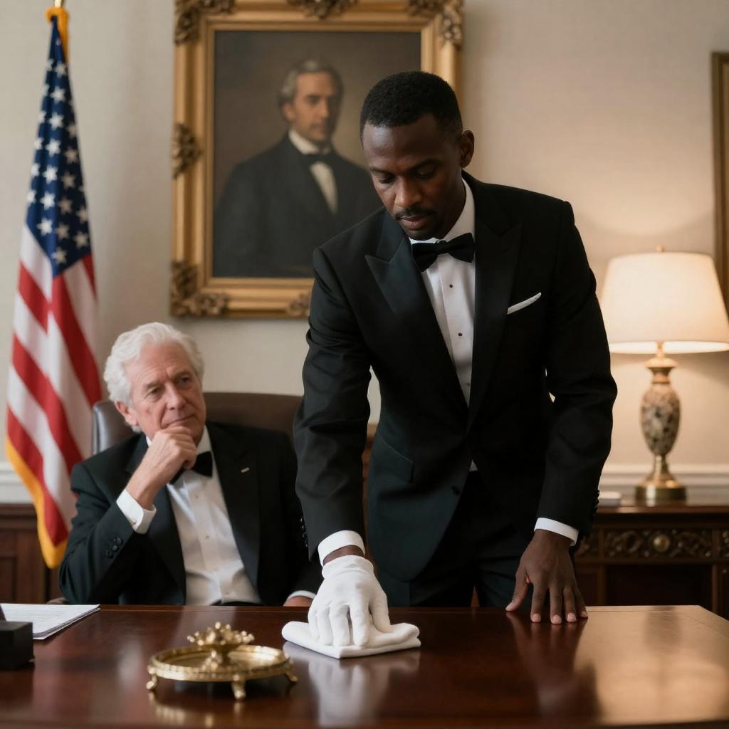 In a formal office setting, a black man dressed in a black tuxedo and bow tie is standing while wiping a wooden table with a white cloth and wearing white gloves. An older white man with white hair, also in a black tuxedo, sits pensively nearby. The room features an American flag, an ornate framed portrait on the wall, a traditional lamp, and a decorative centerpiece on the desk.