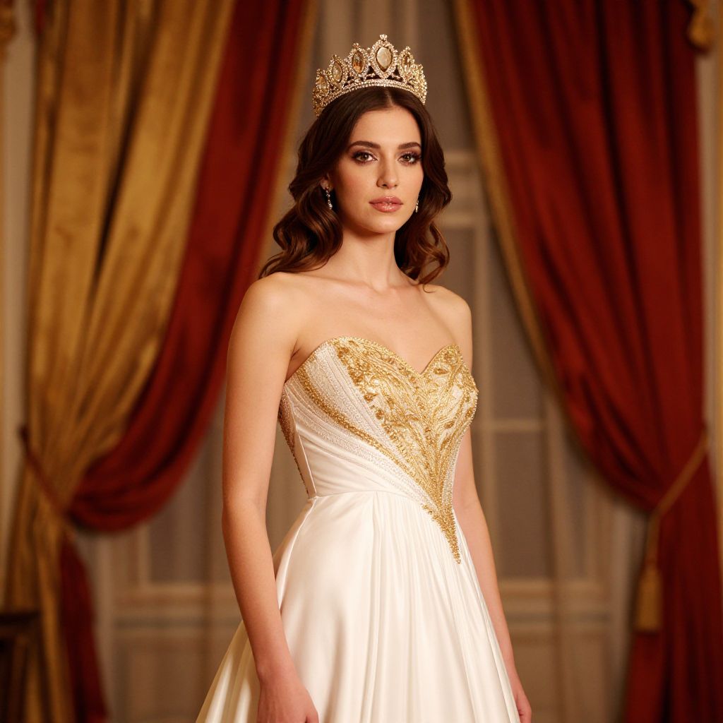 A woman with long, wavy hair is wearing a gold strapless dress with a gold embroidered design. She is standing in front of a gold framed wall.