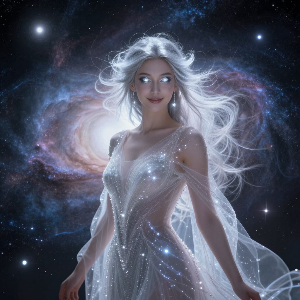 Imagine a photorealistic portrait of an ethereal celestial enchantress with cascading starlight hair and luminous silver eyes. She exudes timeless elegance and mysterious charm with her enigmatic smile. The subject stands against a cosmic nebula backdrop, where swirling galaxies create a mesmerizing dance around her. Her translucent gown, woven with delicate stardust threads, glows softly under the light of distant celestial bodies. This unique blend of natural harmony and futuristic sophistication captures both grace and enigma, inviting viewers to explore the captivating world of this otherworldly beauty.