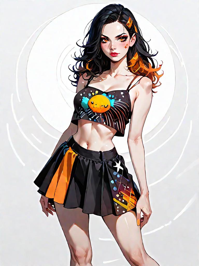 Digital artwork of a woman with a realistic face and full body shot, wearing a black crop top featuring a colorful graphic print with thin spaghetti straps. She pairs it with a vibrant orange and black mini skirt with an asymmetrical hemline. The woman has long black hair with orange highlights, stylish makeup, and a confident pose against a simple white background with circular accents.