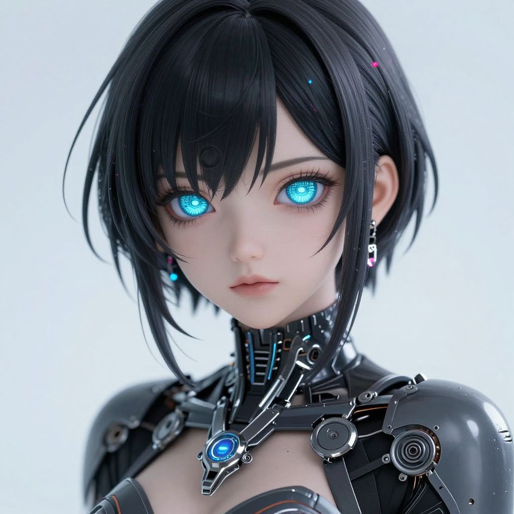 A beautifully detailed cyberpunk anime woman with intricate digital eyes and futuristic armor.