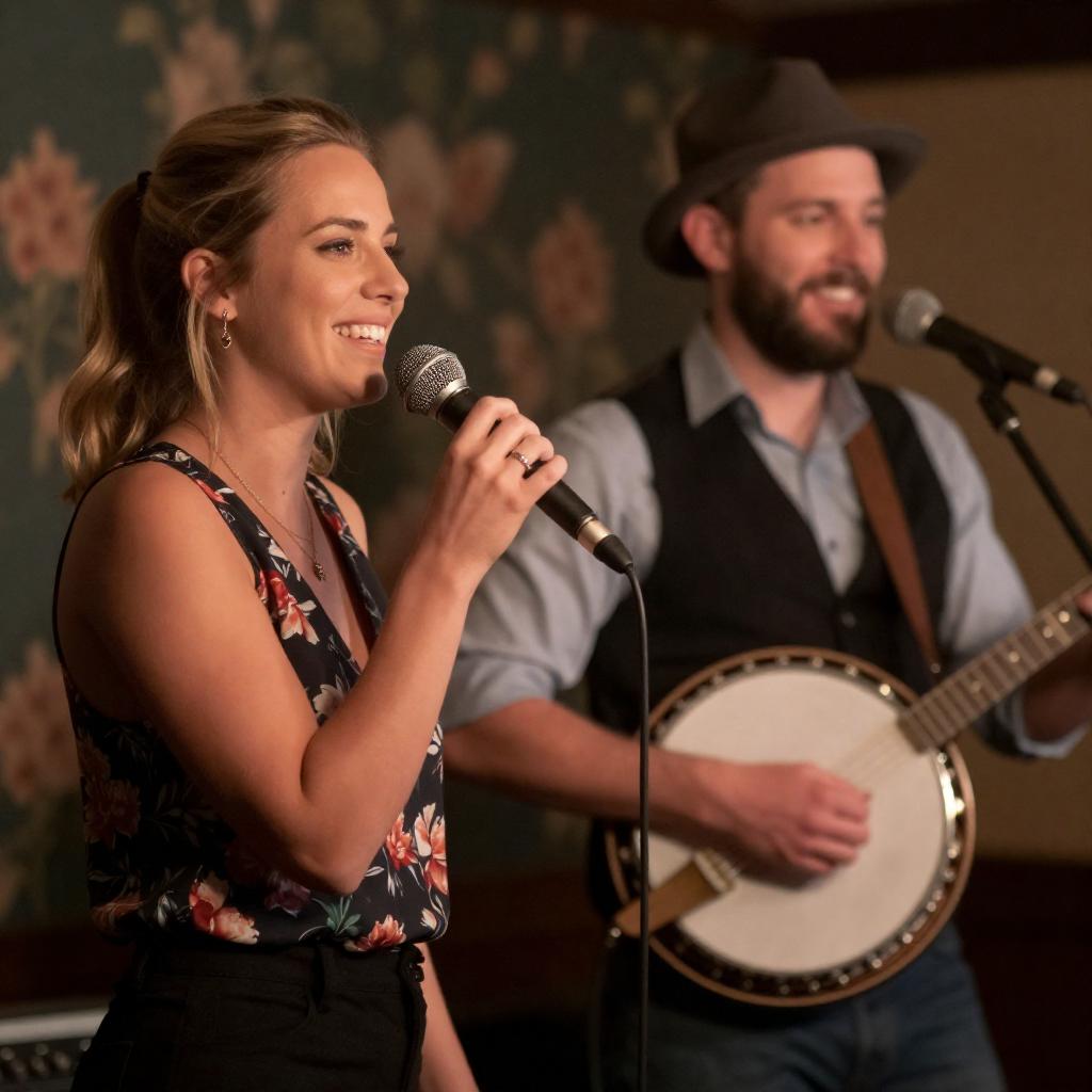 Photograph of a female singer and a male musician. Female singer with blonde hair in a ponytail, sleeveless floral top, smiling, standing left. Male musician with beard, wearing hat, light blue shirt, and black vest, playing banjo, smiling, standing right. Microphones in front. Warm, dim lighting. Background with floral-patterned wall.